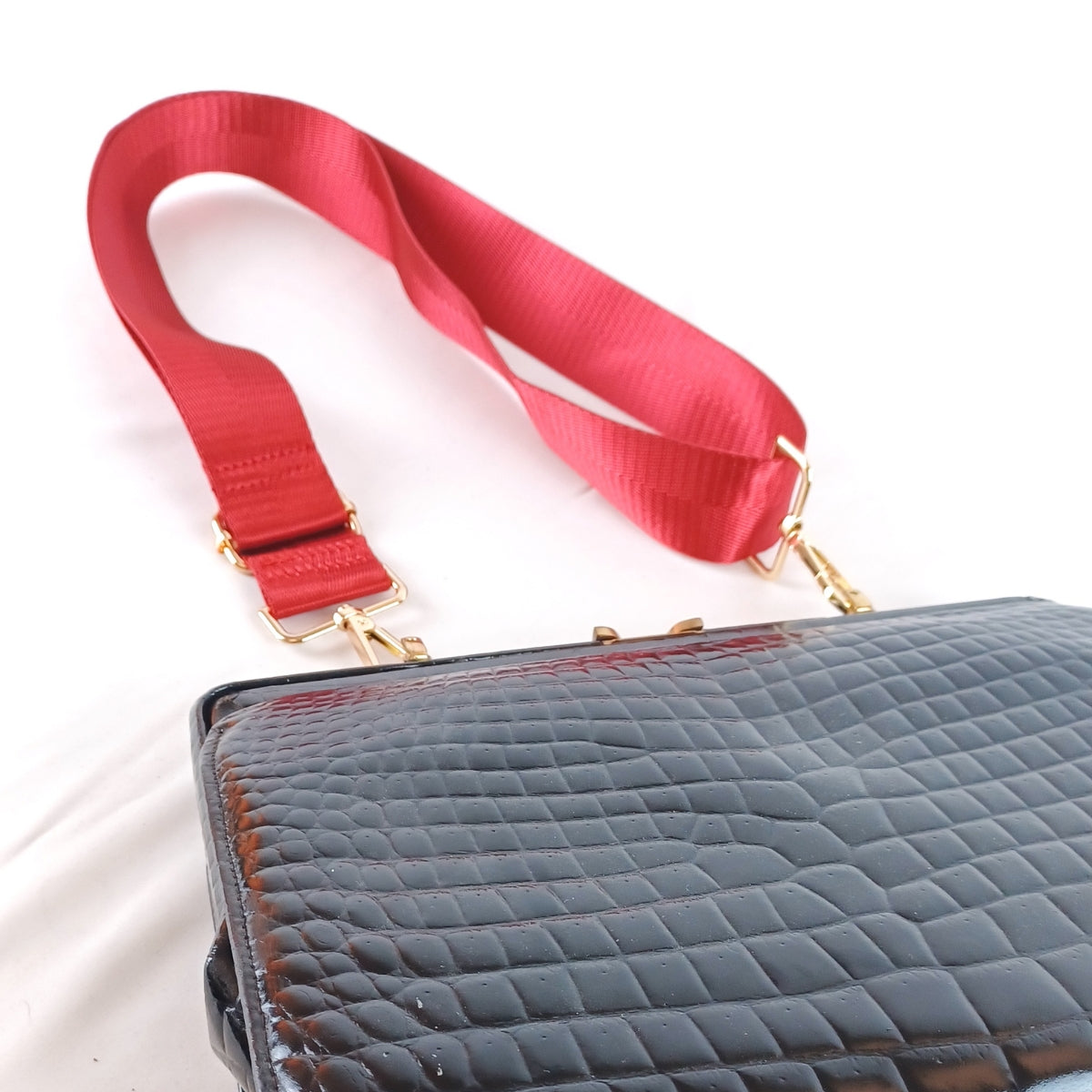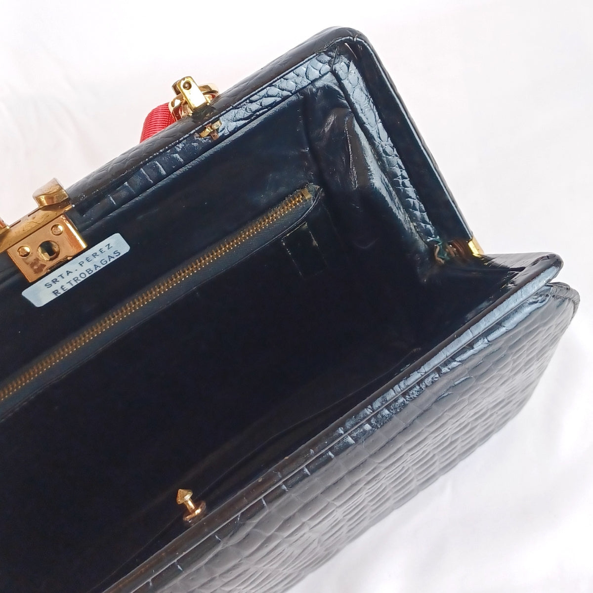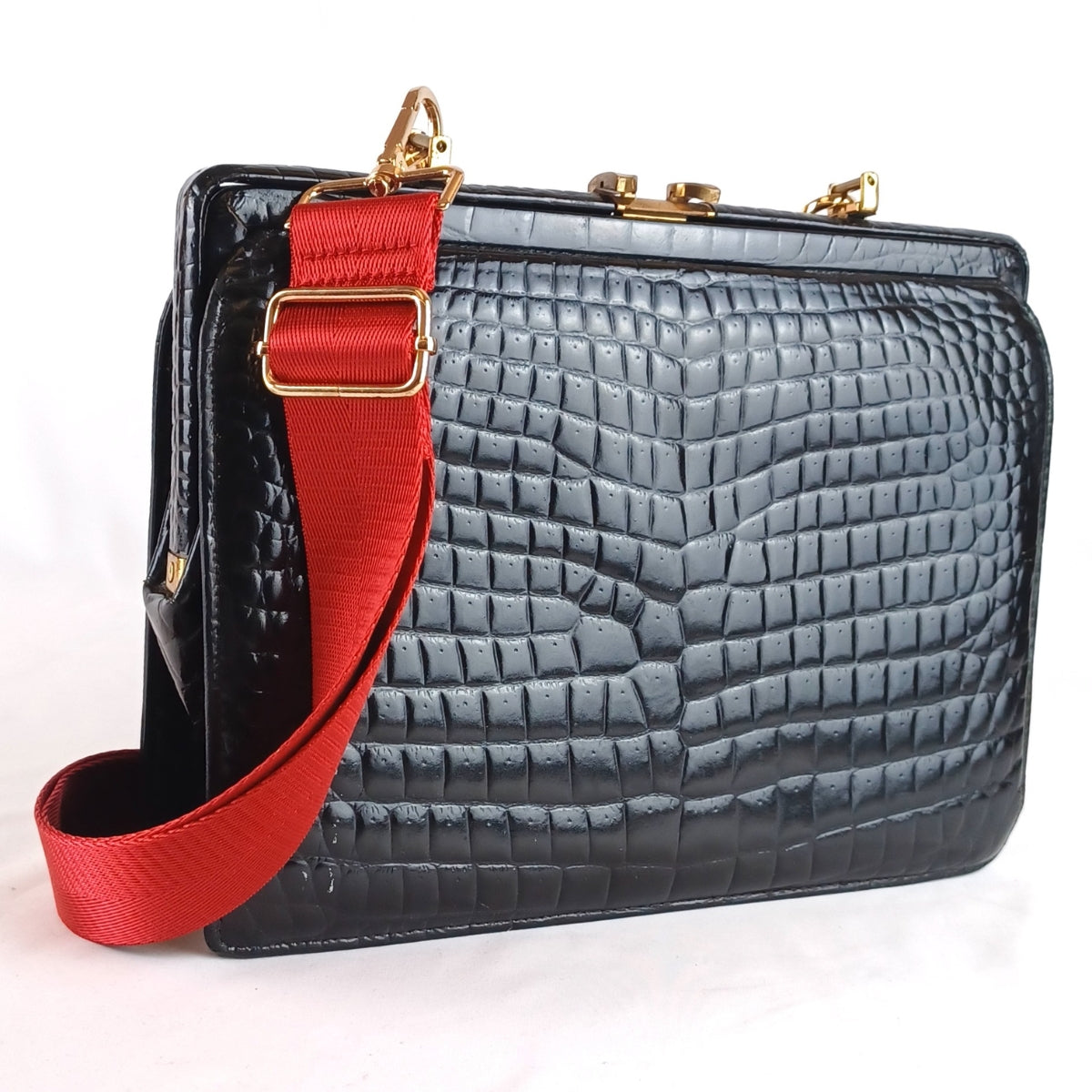 Bolso vintage recuperado, elaborado en simil piel de cocodrilo con acabado acharolado, una pieza con carácter y brillo atemporal.