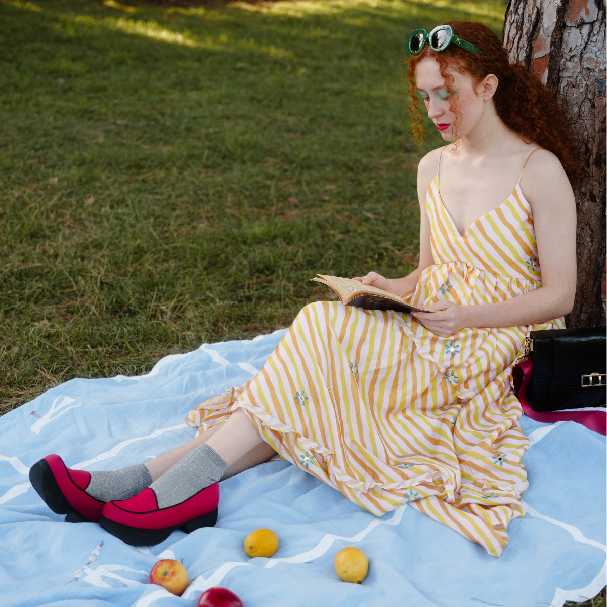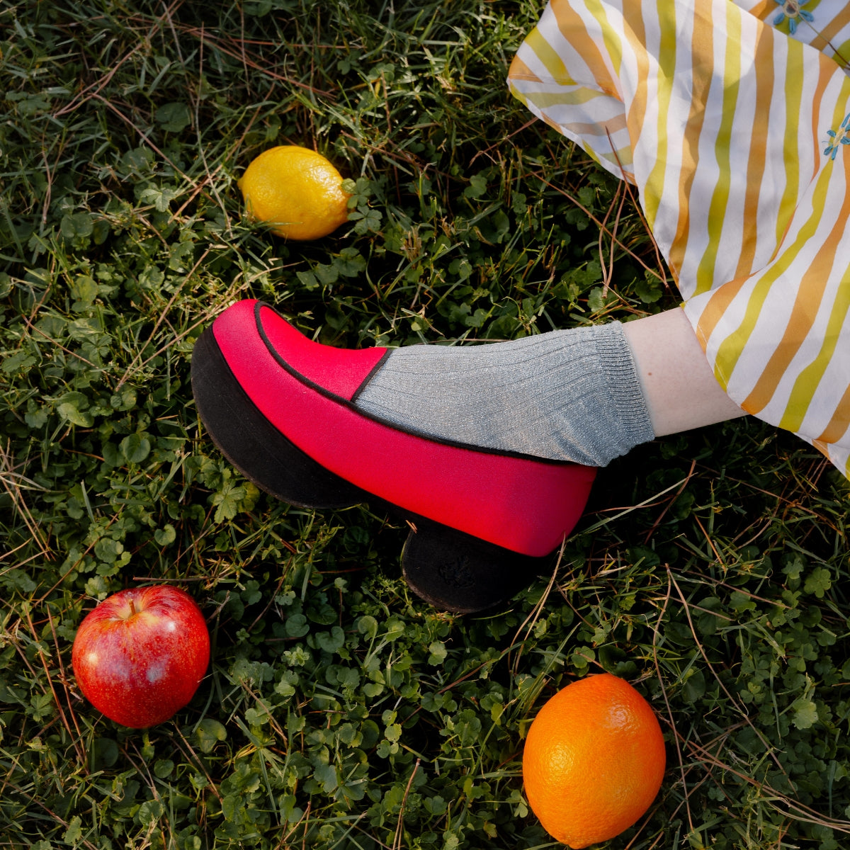 Presenta plataforma uniforme y horma ancha, con puntera redondeada y ligeramente elevada para mayor confort.