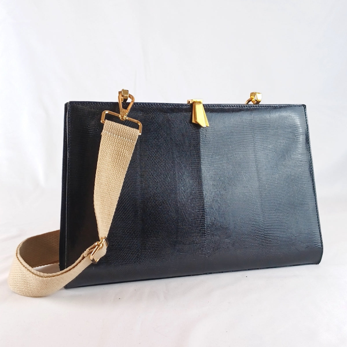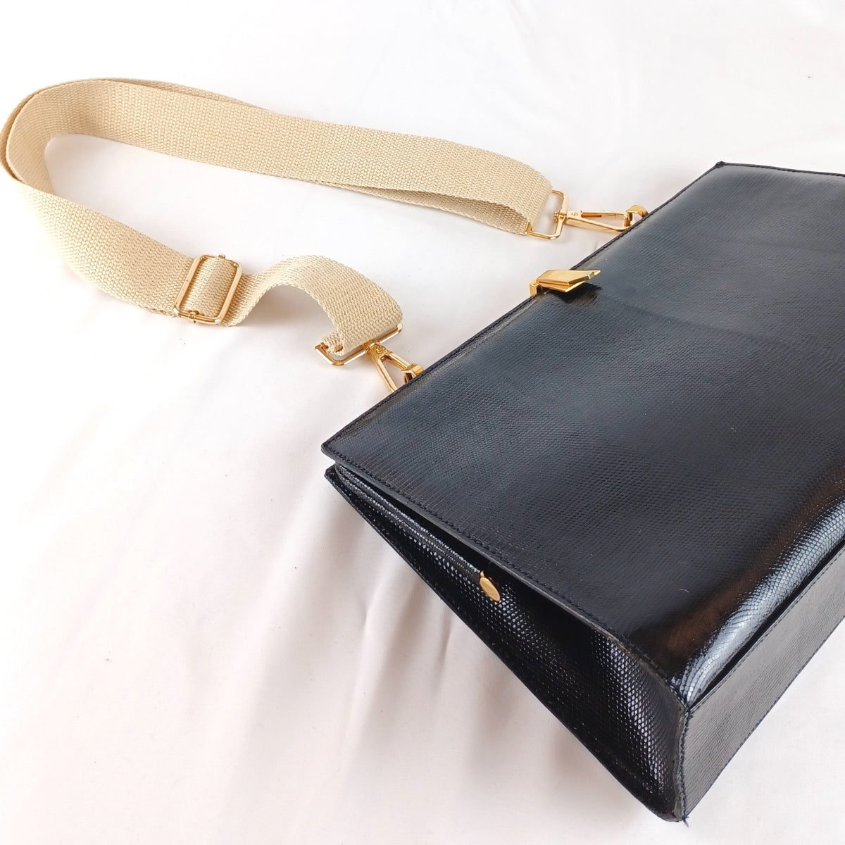 Bolso vintage original, confeccionado en cuero símil negro con acabado acharolado y delicado labrado artesanal.