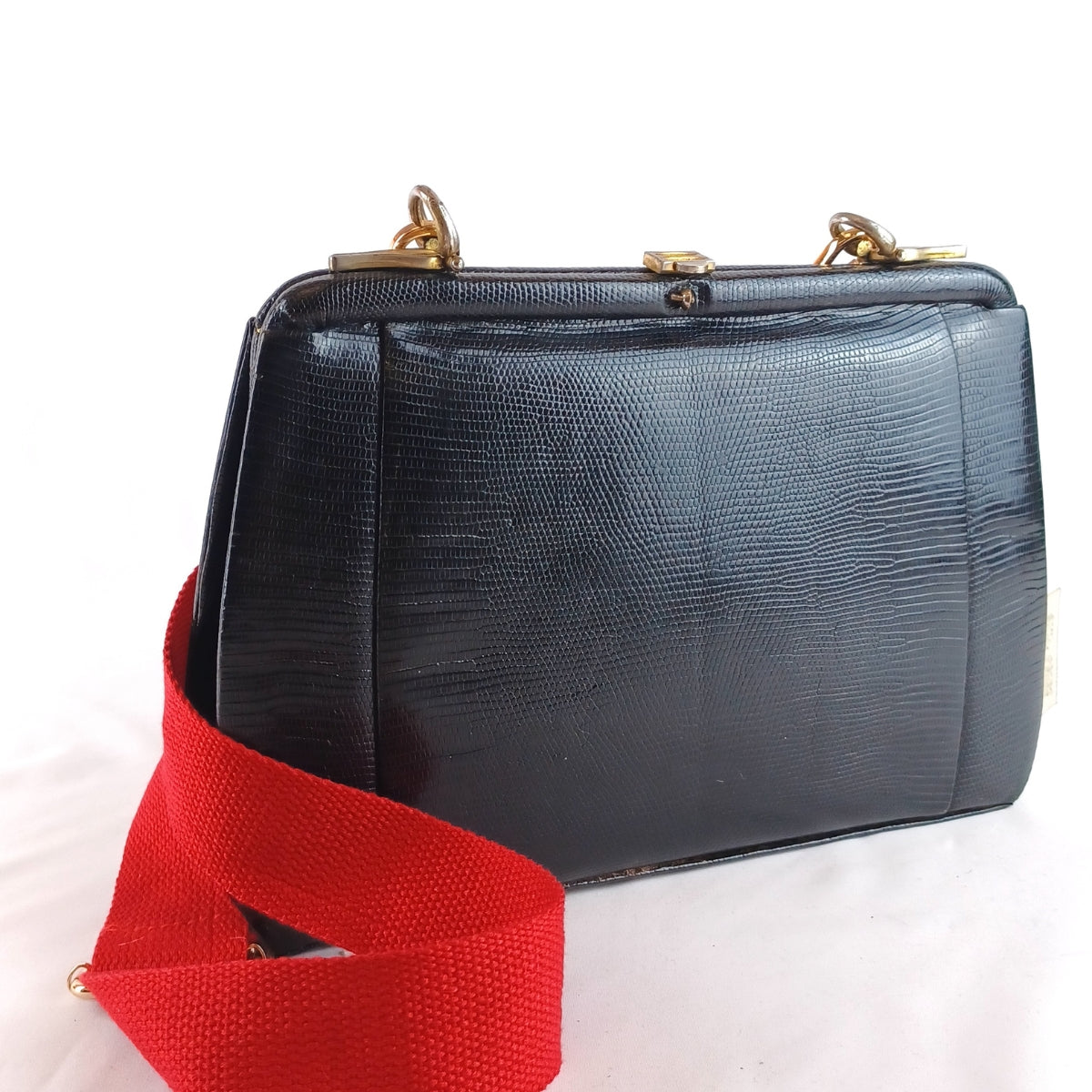 Bolso vintage pequeño, confeccionado en piel legítima de lagarto color negro, una pieza que combina elegancia atemporal y refinamiento artesanal.