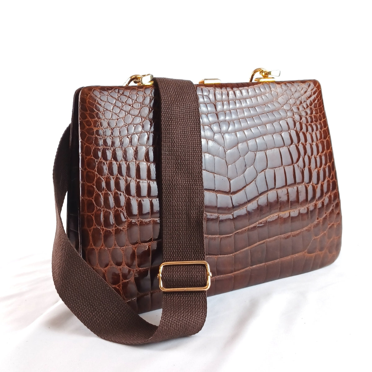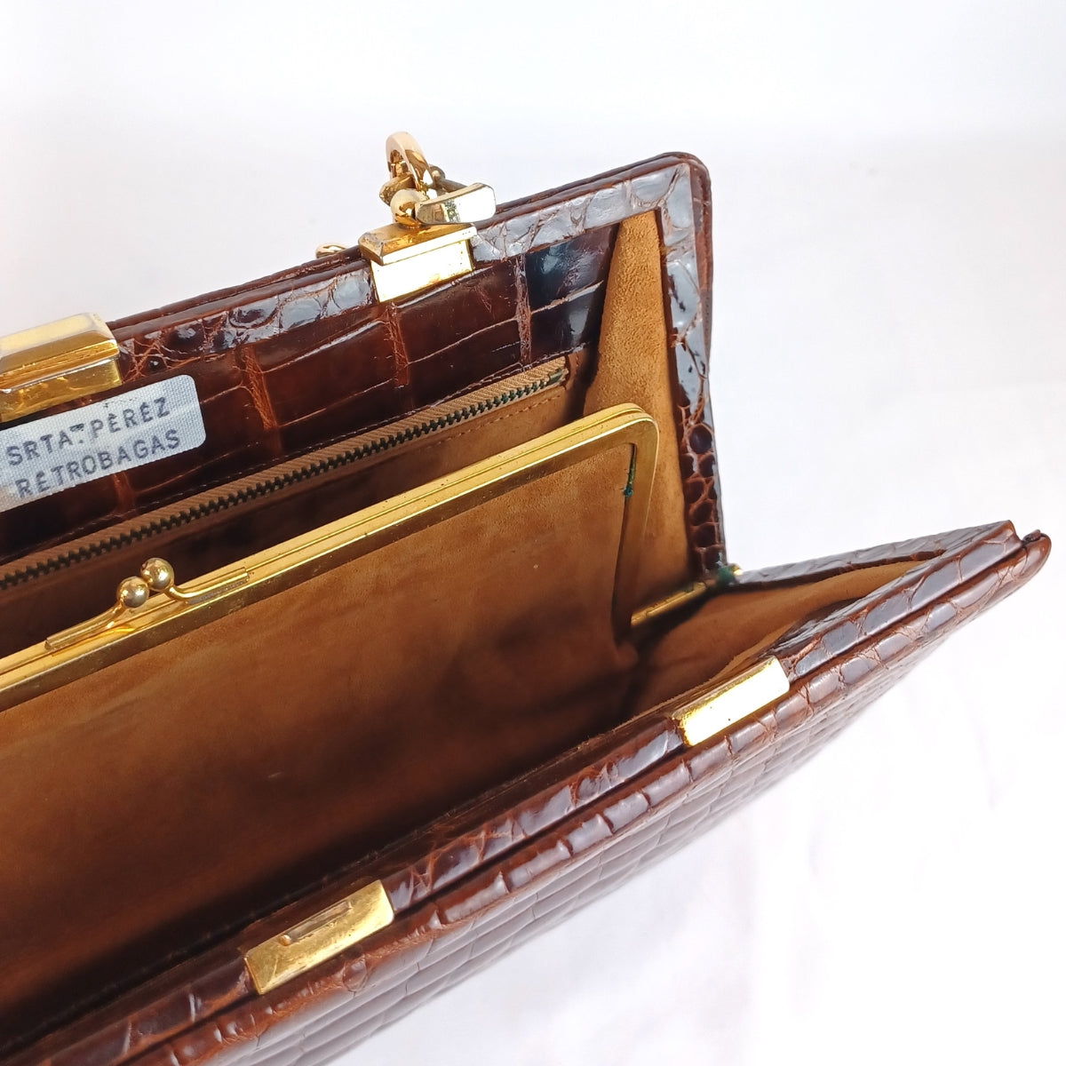 Fabuloso bolso vintage, elaborado en piel legítima de cocodrilo, con una textura suave y brillo sutil que refleja su calidad excepcional.