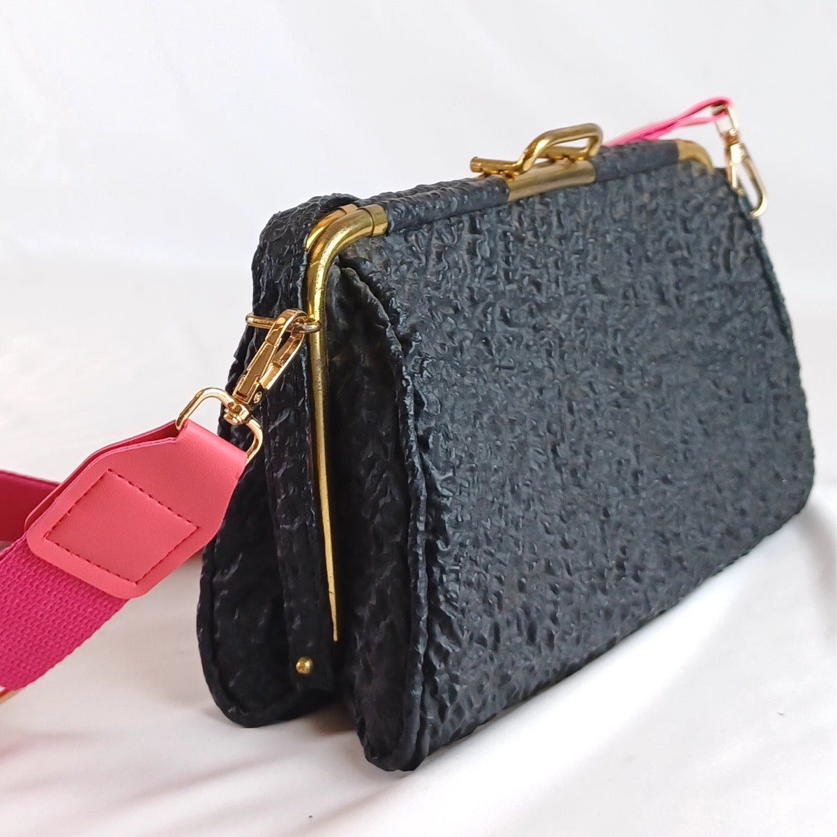 Se completa con su asa original y una bandolera de algodón fucsia ajustable, que introduce un contraste vibrante y contemporáneo.