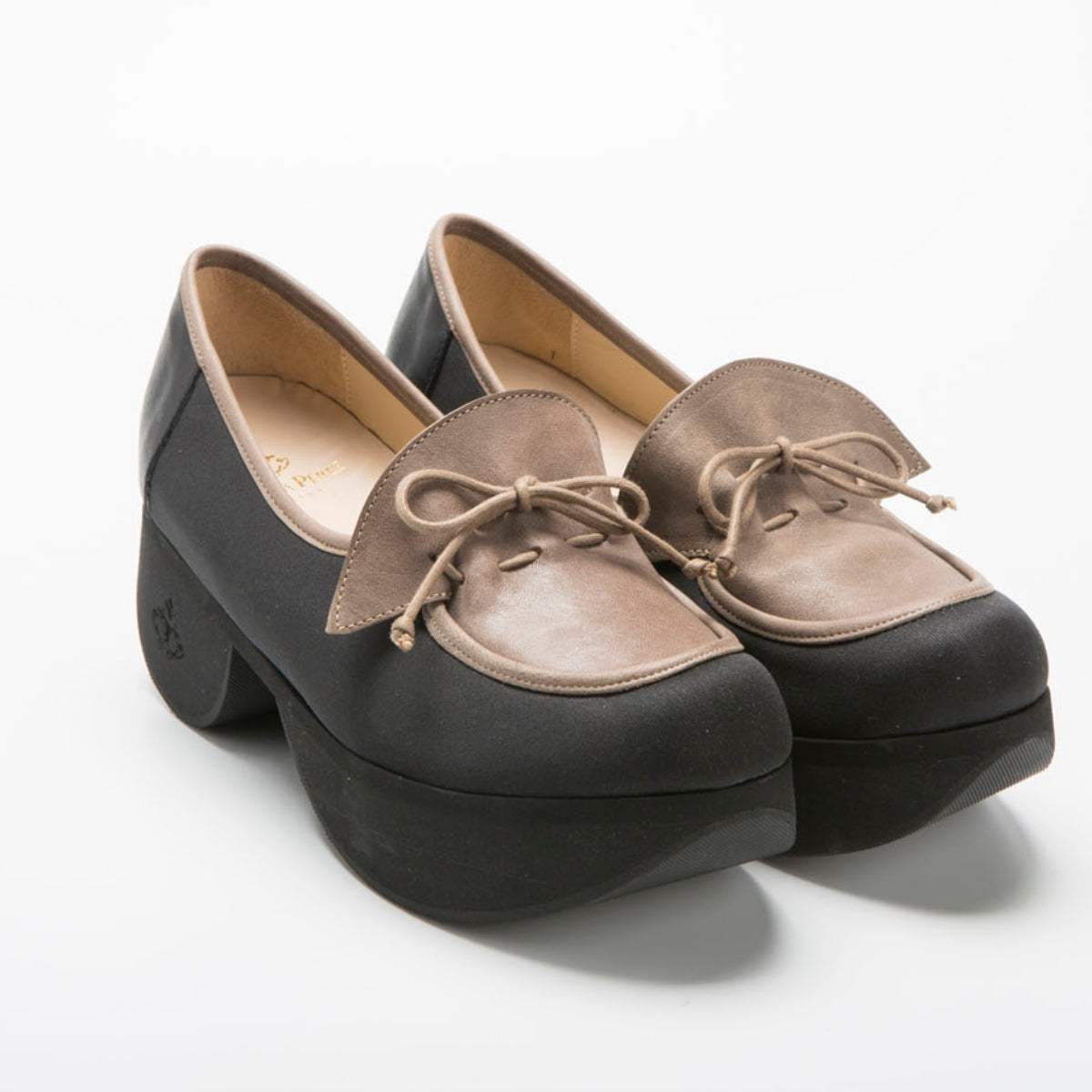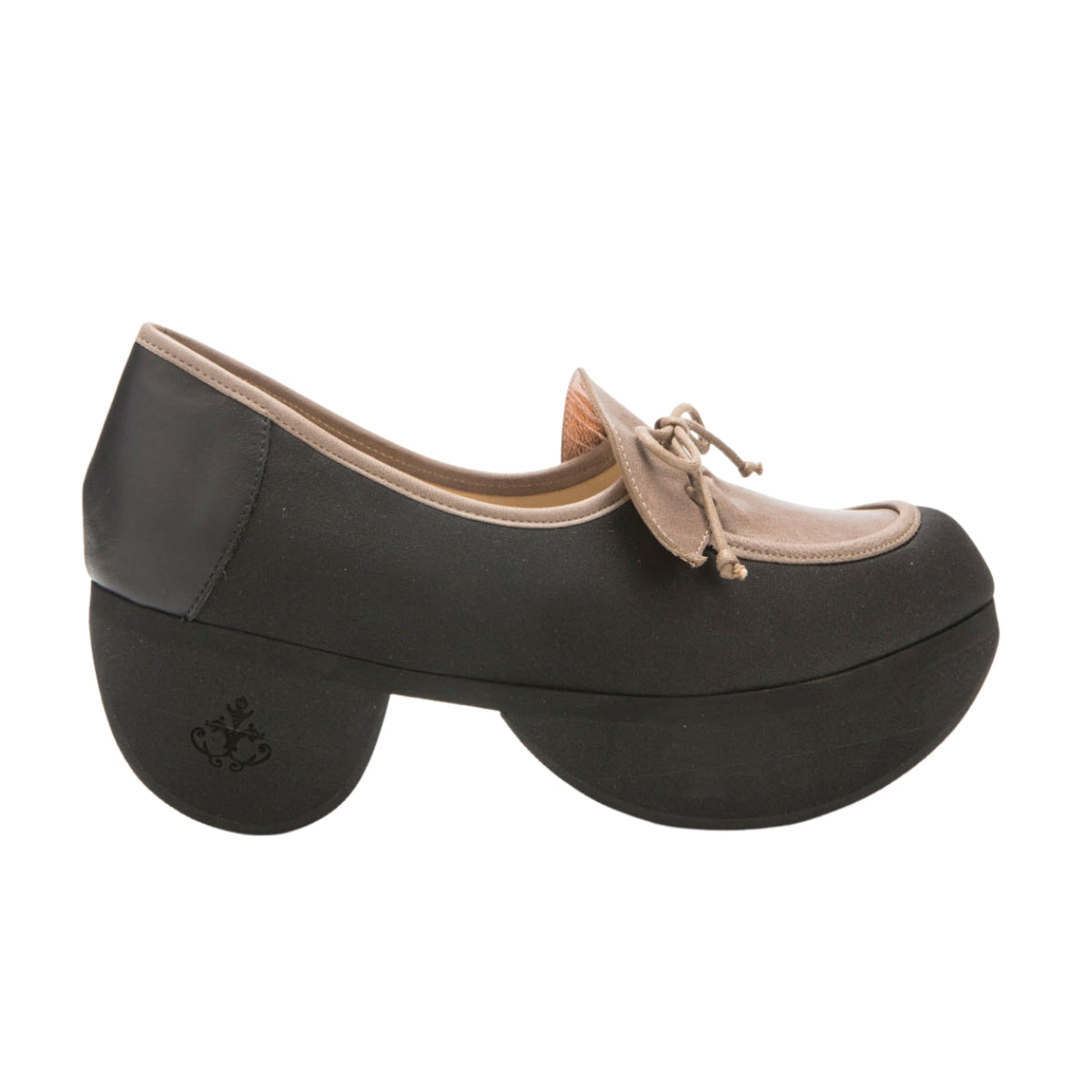 Confeccionado principalmente en neopreno flexible, presenta un empeine de cuero plisado anudado con un delicado lazo y una goma interior que garantiza un ajuste perfecto y cómodo.